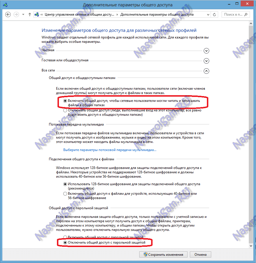 Здесь для всех сетей нужно включить Общий доступ и отключаем парольную защиту. Нажимаем кнопку «Сохранить изменения» и пробуем снова зайти на компьютер по сети.