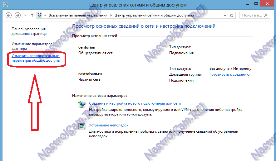 Если при попытке доступа ноутбук будет недоступен, то Вам надо на каждом из ноутбуков открыть доступ по сети, для чего надо снова зайти в «Центр управления сетями и общим доступом» и кликнуть на ссылке «Изменить дополнительные параметры общего доступа»: