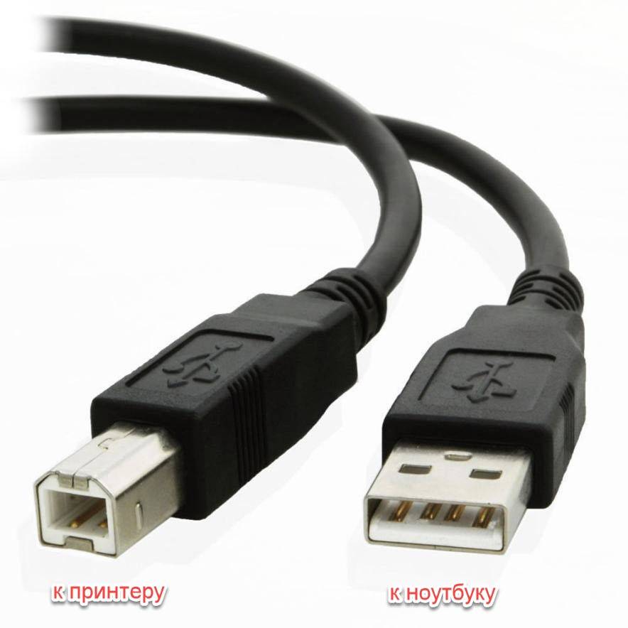 В комплекте с принтером идет два кабеля — чтобы подсоединить его к электросети и ноутбуку/компьютеру. И если первый оснащен стандартной вилкой, то разъемы второго могут быть различными: