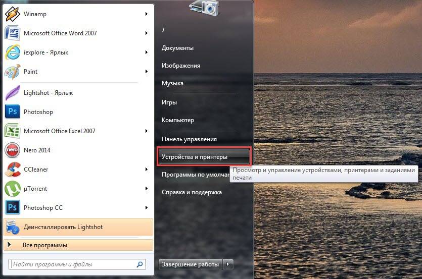 Бывает так, что в автоматическом режиме не найдено подходящего софта. Проходим путь: кнопка Пуск – Устройства и принтеры (другое название «Принтеры и факсы»).