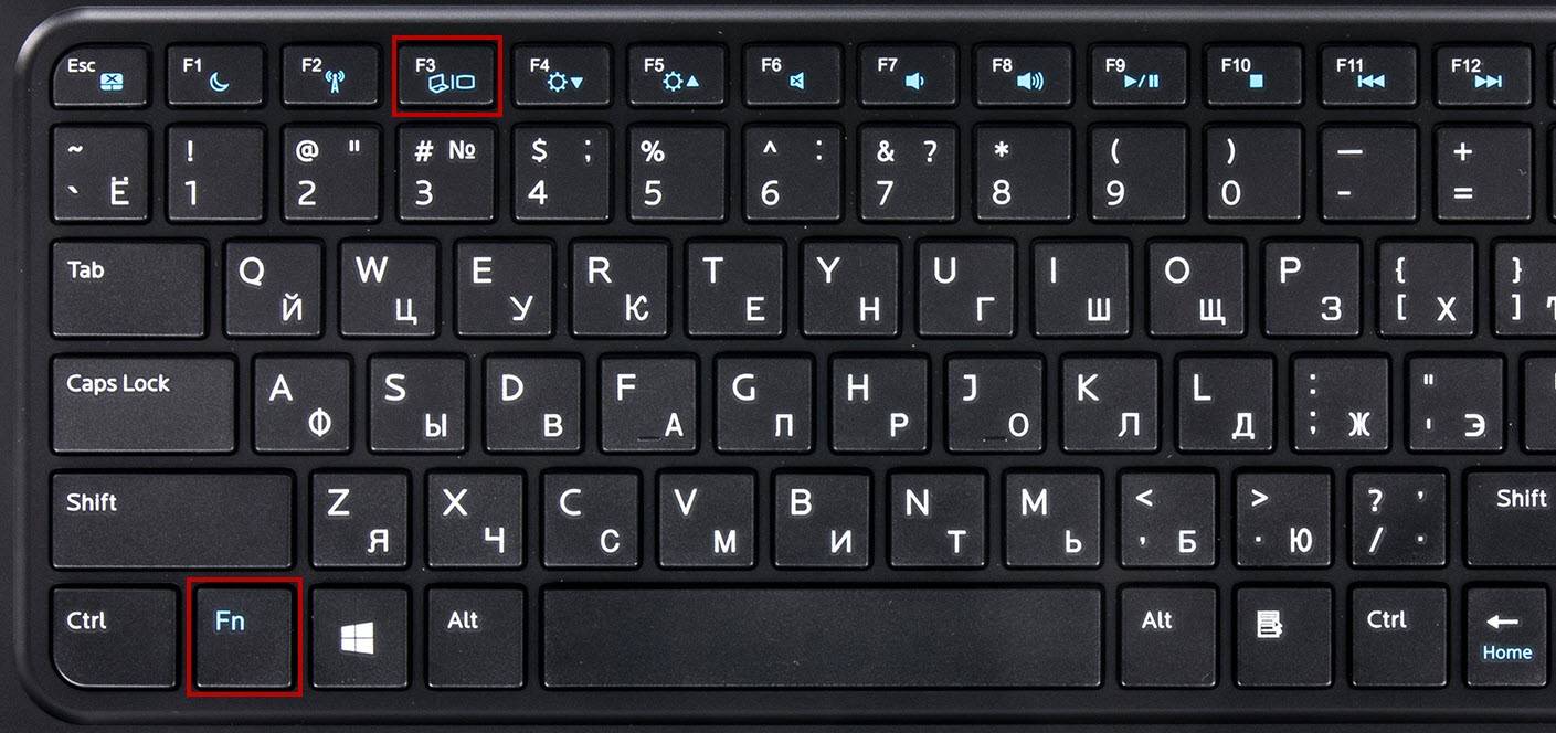 Функциональные клавиши F1….F12 на ноутбуке всегда имеют дополнительные графические обозначения, которые сложно встретить на клавиатуре для стационарного компьютера. На одной из клавиш вы можете заметить изображение монитора и ноутбука.