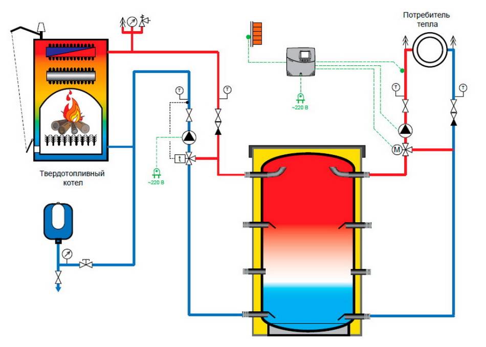 Схема обвязки твердотопливного котла отопления с теплоаккумулятором применяется для поддержания постоянной температуры в системе (ТТК плохо управляются, требуя неустанного контроля за количеством топлива и тягой) и во избежание закипания рабочей жидкости.