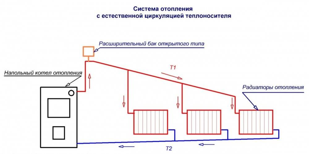 В системах этого типа теплоноситель движется благодаря уклону труб. Для обеспечения циркуляции котел должен находиться в самой нижней точке, все отопительные приборы — выше него. Кроме этого, приходится использовать трубы большого сечения — чтобы снизить сопротивление при движении теплоносителя.