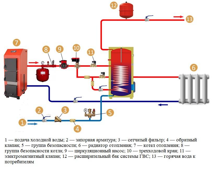 Обвязка твердотопливного котла с бойлером косвенного нагрева подходит для любой схемы подключения. Бойлер служит для нагрева холодной воды в целях горячего водоснабжения.