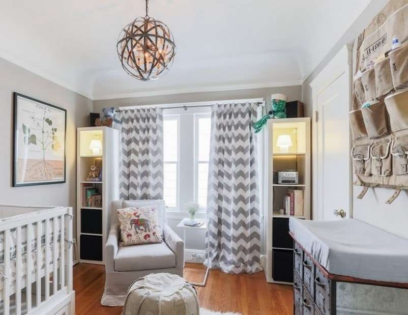 Например, на фоне светло-серых стен темно-серые шторы, плетеные корзины, небольшой коврик у кровати такого-же цвета будут соответствовать стилю. Такими-же могут быть несколько рамок на стенах.