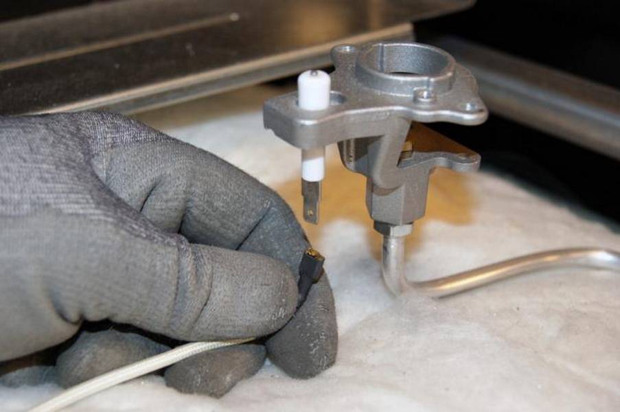- Выход из строя датчика контроля пламени (термопары). При этом на электромагнитный клапан не поступает достаточно напряжения, и он перекрывает подачу газа на духовку.