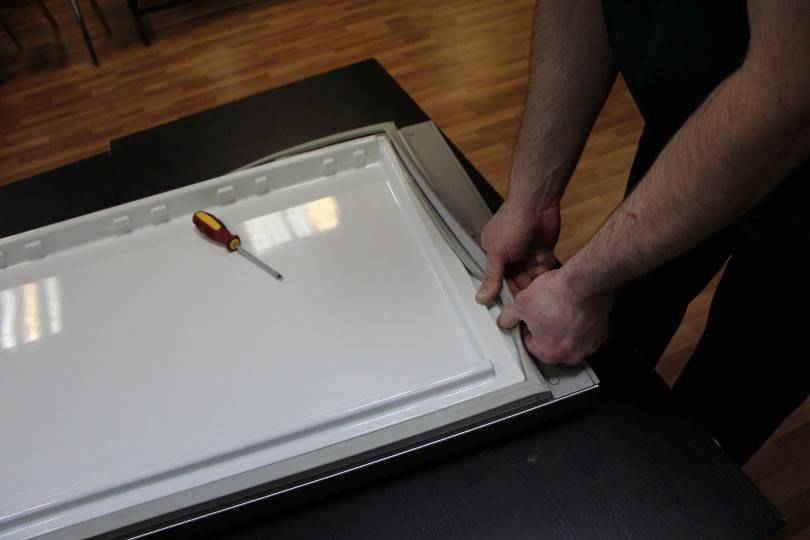 Торопиться нежелательно, важно не повредить другие элементы дверок и корпуса. Если уплотнитель постоянно возвращается на прежнее место, его фиксируют отверткой, вставив ее между краем панели и лентой