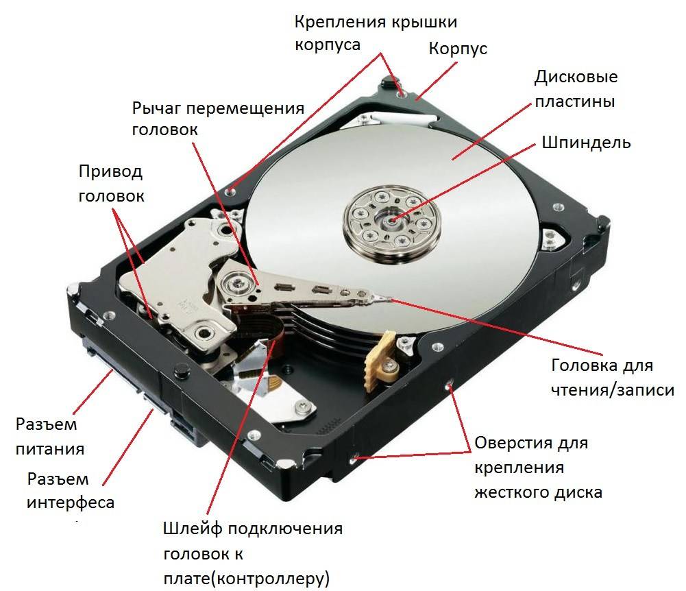 Пользователь должен понимать, из чего состоит жесткий диск, с чем можно ознакомиться на скриншоте ниже. Одним из главных компонентов являются диски и головка, с помощью которой возможно считывать имеющуюся информацию. Они очень быстро изнашиваются, так как скорость их вращения составляет 720 оборотов за 60 секунд. Если пользователь делает запуск каких-либо программ или приложений, то нагрузка увеличивается еще больше.