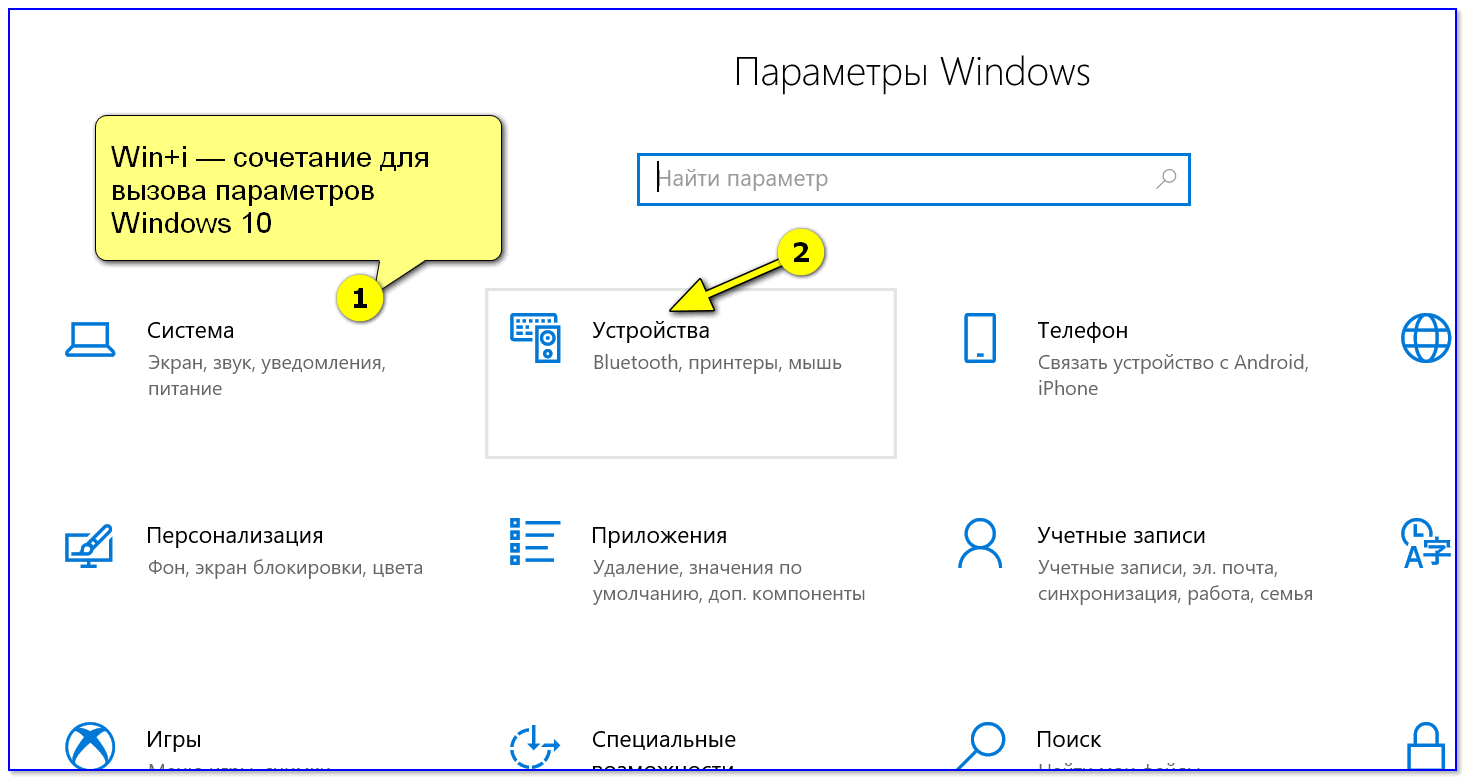 Для этого необходимо сначала открыть параметры Windows (через «ПУСК», или нажав на Win+i) и перейти в раздел «Устройства» . См. скриншот ниже.