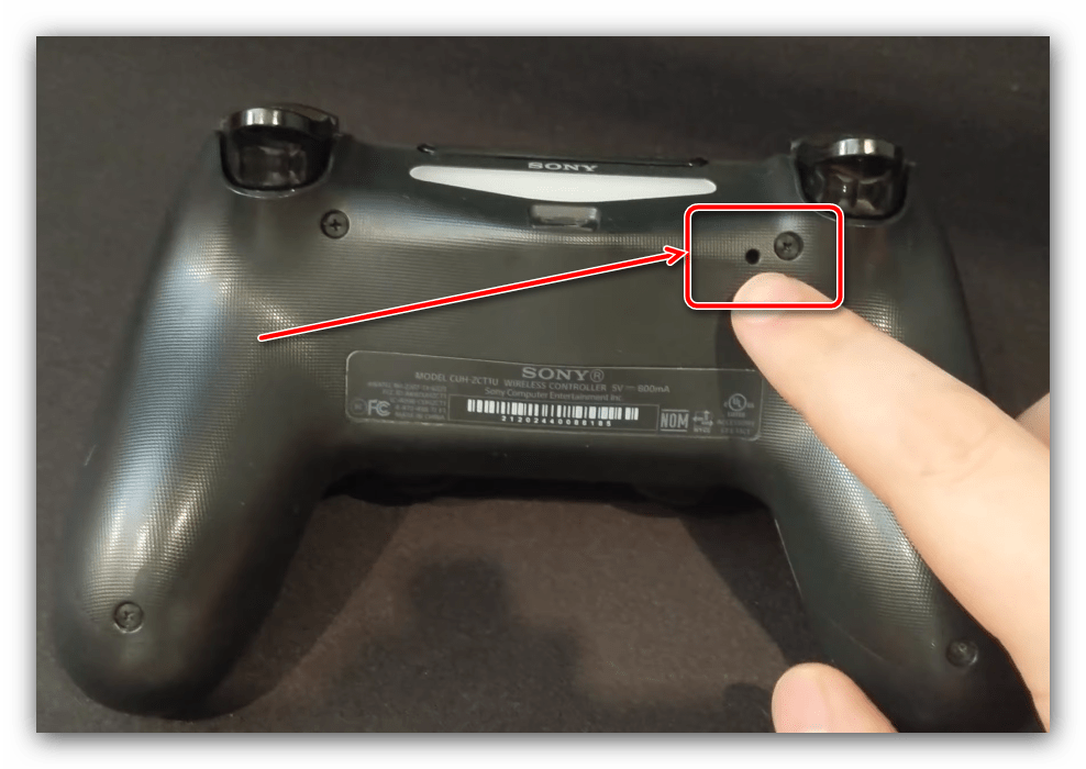 Современные варианты геймпада от ПлейСтейшн 4 представляют собой сложные устройства с собственной материнской платой и фирменной прошивкой. Как и в случае с другими подобными девайсами, время от времени случаются те или иные программные ошибки, в результате которых контроллер может не заряжаться. Для решения такой проблемы следует сбросить девайс: возьмите тонкий длинный предмет (подойдут разогнутая канцелярская скрепка или инструмент для извлечения SIM-лотка из современного смартфона), затем вставьте его в отверстие на днище геймпада, которое находится в отмеченной на изображении ниже зоне, и нажмите до щелчка.