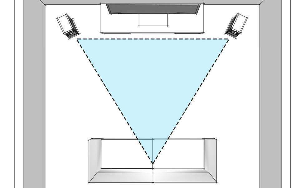 Базовый принцип, без которого невозможно добиться хорошей сцены и образности, таков: точка прослушивания и колонки должны располагаться по схеме равностороннего треугольника. Слушатель должен сидеть точно между двумя акустическими системами (эта точка называется «зоной комфортного прослушивания»). Расстояние до каждой колонки должно быть лишь немного большим, чем расстояние между самой акустикой. Если этот основной принцип не соблюден, то о хорошей звуковой сцене не может быть и речи.