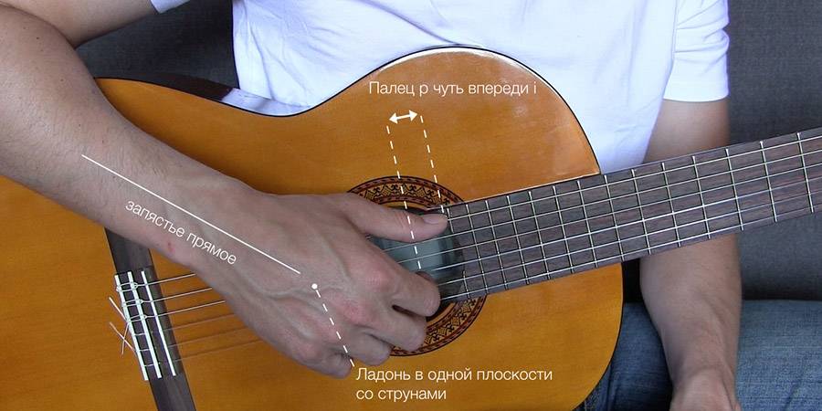 Чтобы играть правой рукой, ее располагают на верхней части обечайки. Вначале опускают вниз, расслабляют. Указательный, средний, безымянный пальцы при игре сгибают так, чтобы между ними и большим получился крест. Подготовленную руку подносят к струнам. Вес руки должен приходиться на большой палец – это точка опоры. Кисть не должна прыгать, играть необходимо только пальцами.