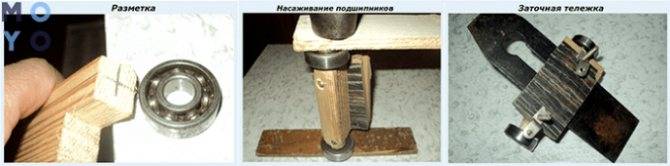 Этим бруском ведут по точильному камню. Заточка вполне удовлетворительная, но возникает дополнительное трение древесины, которая к тому же постепенно стачивается. А в описанной конструкции подшипники качения снимают эту нагрузку.