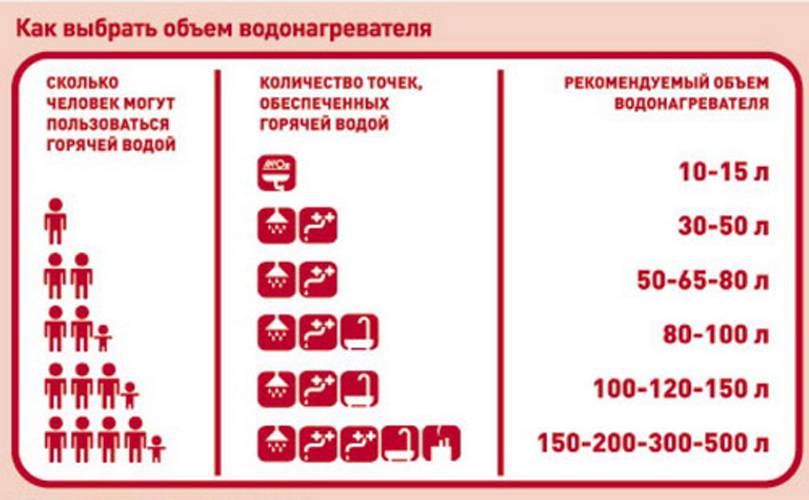 Данная характеристика относится к накопительным водонагревателям и является одним из ключевых параметров. Как подобрать емкость? Для этого нужно ориентироваться на количество потребителей и количество точек водоразбора. Ознакомьтесь с рекомендуемыми параметрами: