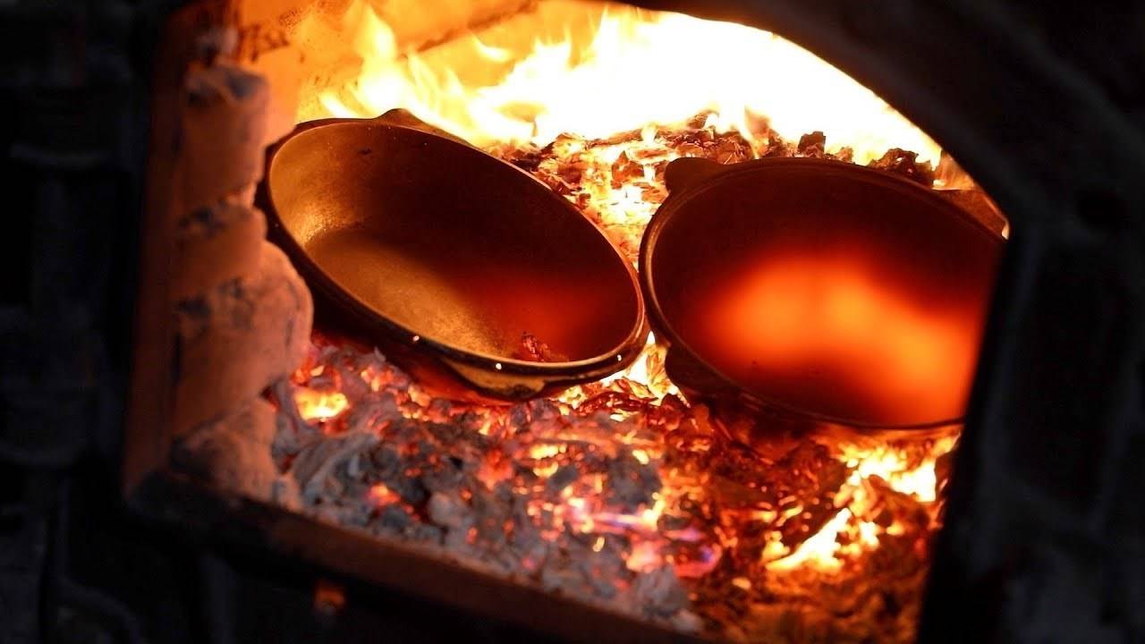 - На свежем воздухе. Чугунный казан нужно тщательно вымыть в теплой воде, обсушить. Далее начать прогревать на открытом огне, пока не перестанет источаться едкий запах и дым, а затем исчезнут все темные пятна внутри посуды. Если появятся светлые пятна, не стоит беспокоиться, вы просто перегрели котелок. На процесс уходит приблизительно от 2 до 3 часов. Именно из-за дымности процесса, лучше пользоваться этой технологией на открытом воздухе, чтобы не пугать соседей в округе.