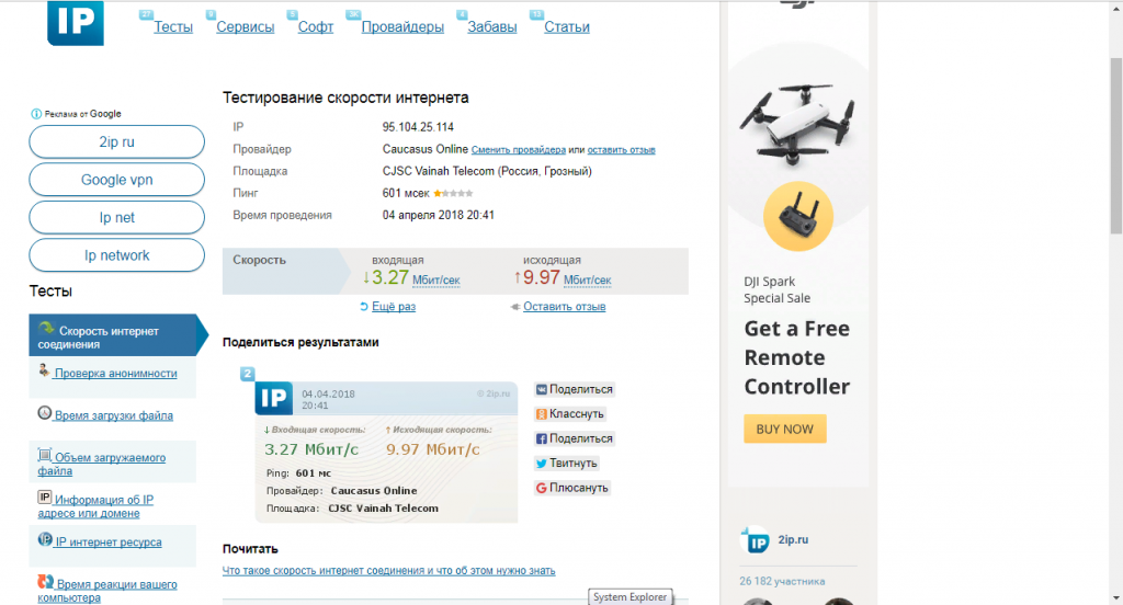 Проверка скорости интернета с помощью сервиса 2ip