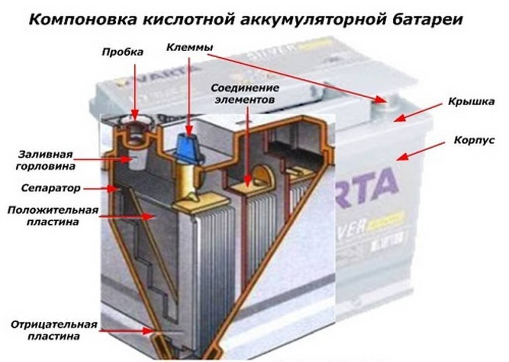 Чтобы узнать, какой процесс происходит в аккумуляторе во время его работы, необходимо подробно рассмотреть его устройство. Конструкция современного кислотного аккумулятора включает в себя: