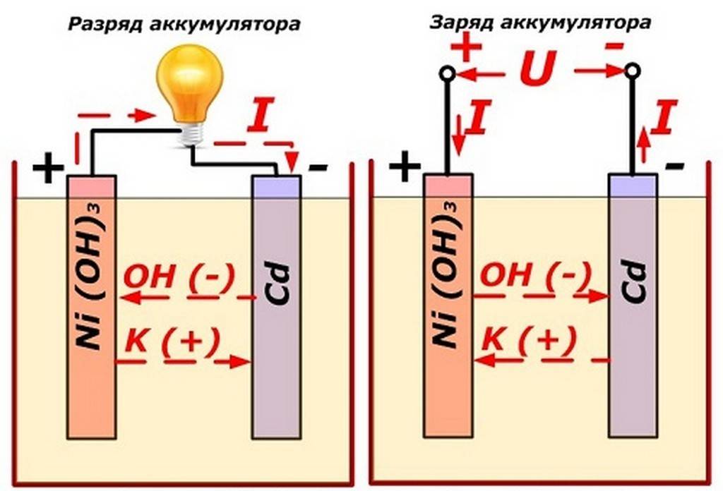 Этот процесс условно показан на схеме с никель-кадмиевой конструкцией электродов.