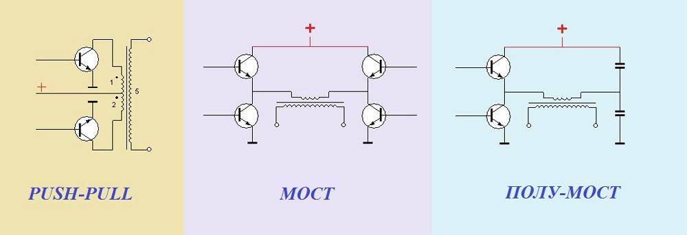 - второй элемент – каскад силовых ключей, включающий собранные по специальным схемам транзисторы (схема со средней точкой Push-Pull, мостовая или полумостовая);