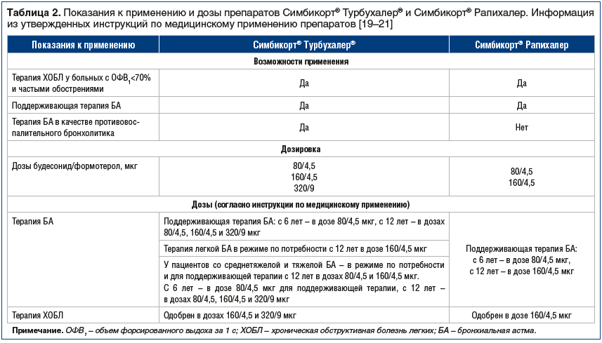 Симбикорт Рапихалер снабжен счетчиком доз и защитой от случайной активации . Средний массовый диаметр аэрозольных частиц, которые продуцирует Симбикорт Рапихалер, составляет 3,3–3,6 мкм . Частицы жидкости по сравнению с частицами порошка лучше проникают в дыхательные пути: при столкновении со стенкой бронха капли жидкости разбиваются на мелкие фрагменты и продолжают движение в периферические отделы бронхов. Жидкие частицы размерами 3,3–3,6 мкм проникают в дыхательные пути так же хорошо, как частицы порошка размером около 2,1 мкм. Следовательно, Симбикорт Рапихалер по способности доставлять препарат в дыхательные пути эквивалентен ингалятору Симбикорт Турбухалер , и при переходе с использования одного устройства на другое не требуется пересчета дозы (табл. 2). Причем на долю мелких частиц (менее 4,7–5 мкм) как в ПИ Турбухалер, так и в ДАИ Рапихалер приходится около 60% . Таким образом, фракция респирабельных частиц в этих ингаляторах существенно выше, чем в большинстве ПИ (см. табл. 1).