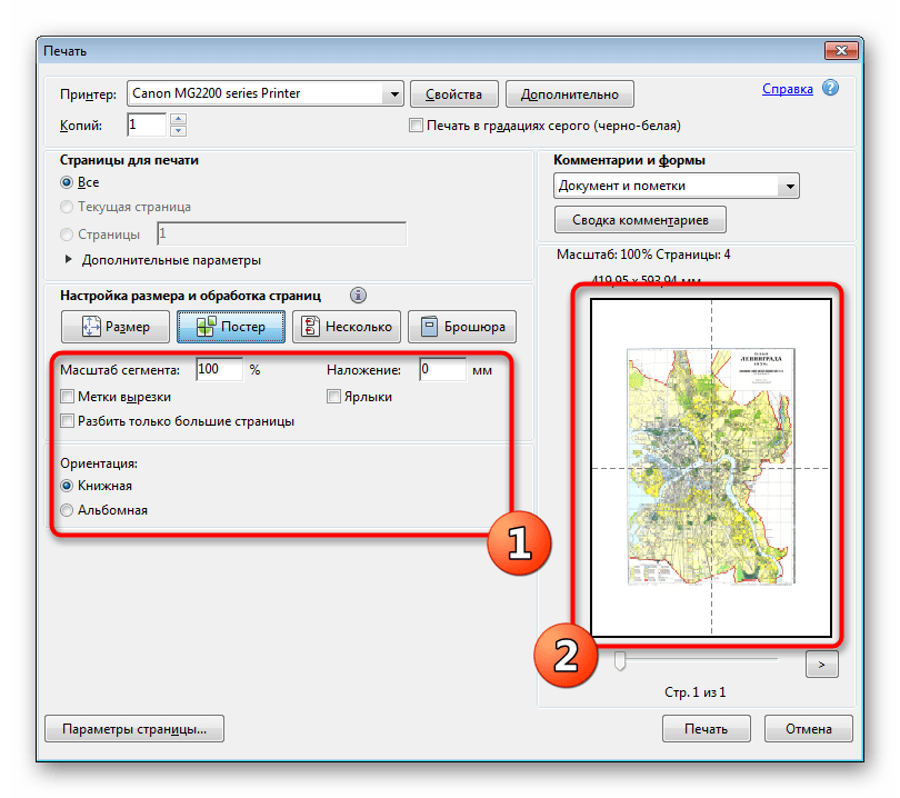 Здесь задайте масштаб и проверьте расположение частей картинки на листах, воспользовавшись средством предпросмотра.