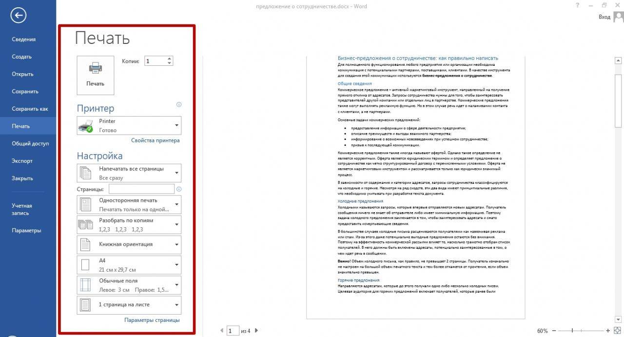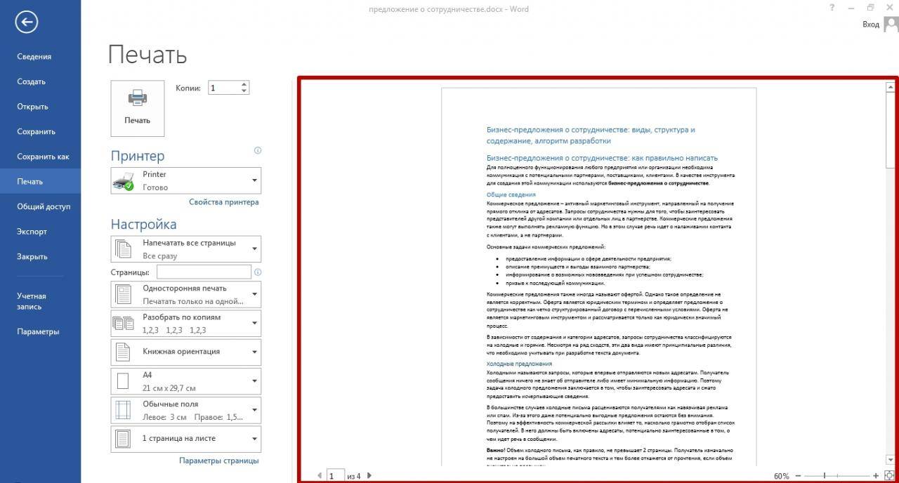 В MS Word можно просмотреть файл с текстовым содержанием перед отправкой на устройство. Программа автоматически создает копию итоговой версии. Она отображается в разделе «Печать», куда Вы можете перейти из меню или с помощью горячих клавиш.