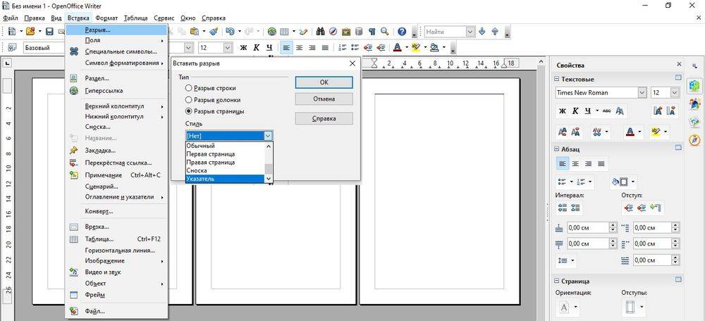 В OpenOffice пустой лист добавляется через меню «Вставка» – «Разрывы»: