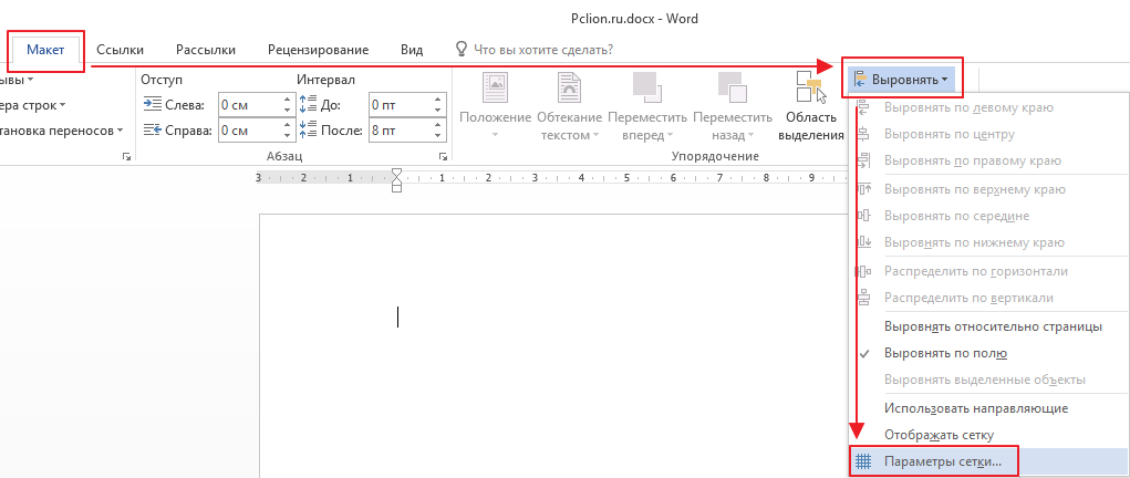 Теперь, чтобы видеть, как текст будет располагаться в клетках тетради, нужно добавить сетку. Сетка не печатается и нужна только для удобства. Перейдите на вкладку Макет > Выровнять > Параметры сетки: