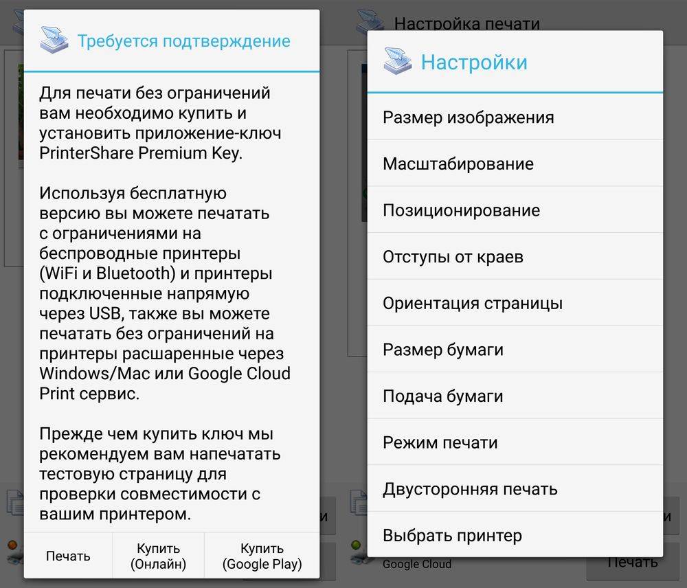 Возможности настроек Printshare и предупреждение о платной версии