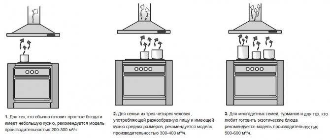 Ориентировочные показатели необходимой производительности вытяжки в кухне