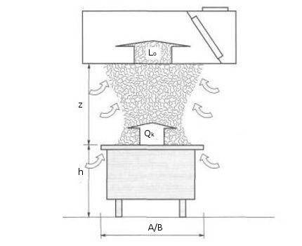 Мощность кухонной вытяжки прямо зависит от тепловых параметров плиты. Именно конфорки формируют конвекционный поток, требующий вытяжки. Условные обозначения: Lo – расход воздуха, A/B – ширина и глубина плиты, h – высота плиты, Z – высота от плиты до вытяжки, Qk – суммарная тепловая мощность конвективного потока