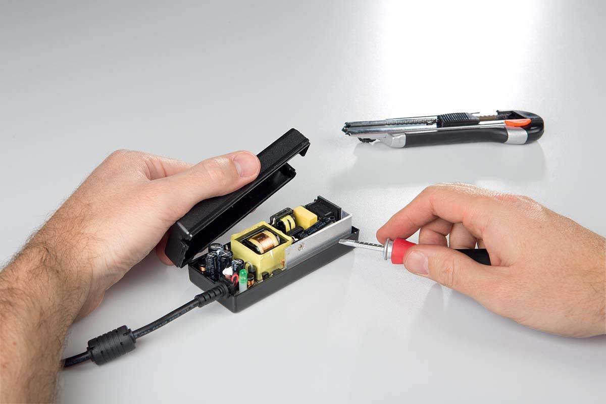 Открыть корпус внешнего адаптера можно посредством отвёртки, ножа либо иного острого предмета. Ряд умельцев перед вскрытием аккуратно через шприц проливают шов бензином, который якобы растворяет пластик и упрощает вскрытие корпуса.