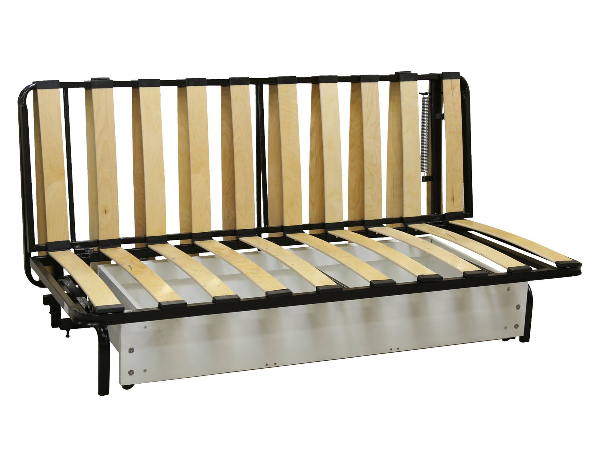 Механизм работает по принципу “французской раскладушки”. Может принимать три положения. Спальное место может быть оформлено ламелями или металлической сеткой.