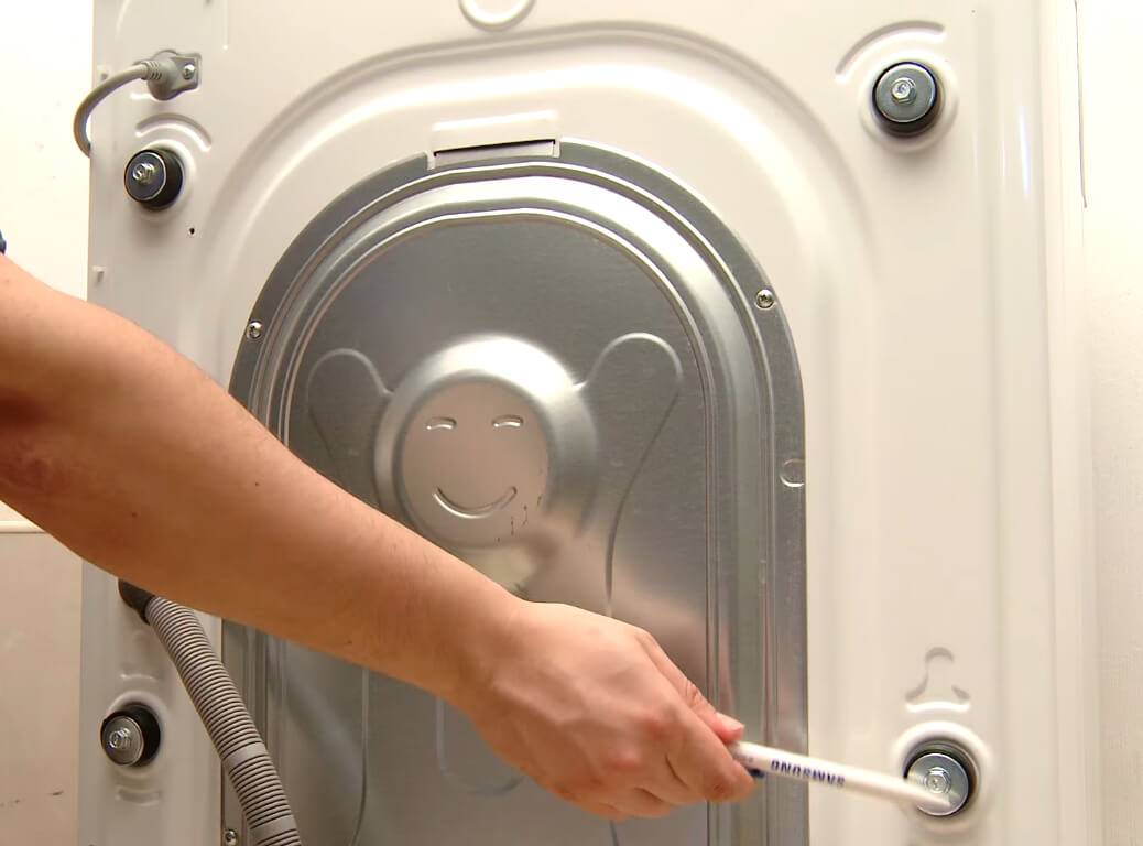 - На стиральных машинах Electrolux и Zanussi этот процесс немного сложнее. Необходимо развернуть технику тыльной стороной, выкрутить саморезы и убрать заднюю крышку.