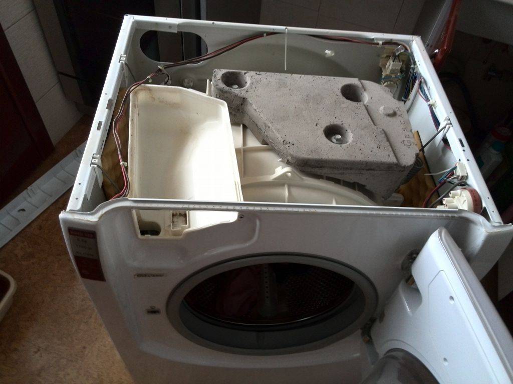 - Вверху стиралки вы увидите противовес. Он похож на большой кирпич или камень. Подберите подходящую головку, чтобы открутить крепежи.