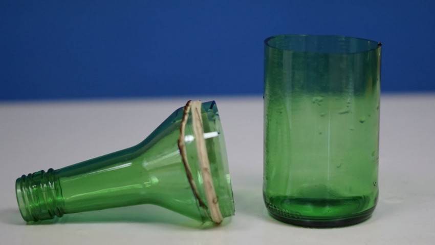 На бутылке делается надрез по кругу бутылки при помощи стеклореза или сверла. Для разрезания понадобится чайник с кипятком и из-под крана холодная вода. На линию надреза небольшой струйкой льется горячая вода, желательно не заходить за границу надреза. Затем бутылка размещается под струю холодной воды. Процесс чередования горячей и холодной воды нужно повторять до раскола тары на части. Края зачищаются наждачной бумагой, сначала грубой, затем мелкой.