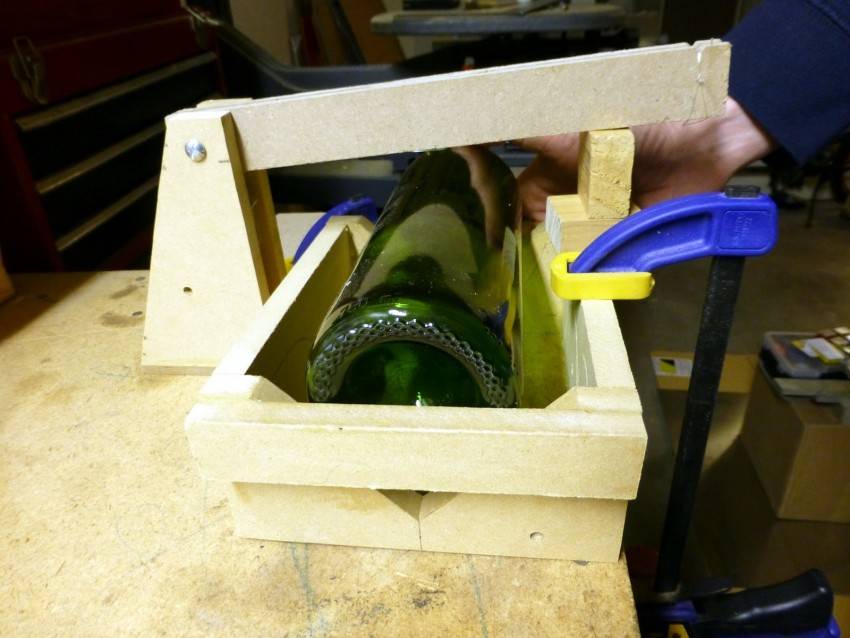 Здесь потребуется стеклорез. Можно использовать заводскую модель или изготовить самостоятельно. Конструкция самодельного устройства может быть различной: главное, чтобы бутылка и режущий элемент надежно фиксировались, но бутылка при этом свободно вращалась.