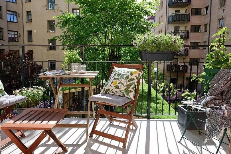 - оптимальный выбор из мебели – складные варианты. В холодное время года ее придется хранить в квартире, а значит элементы интерьера должны быть максимально компактными;