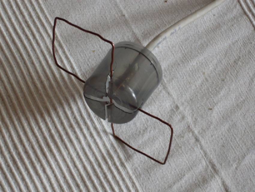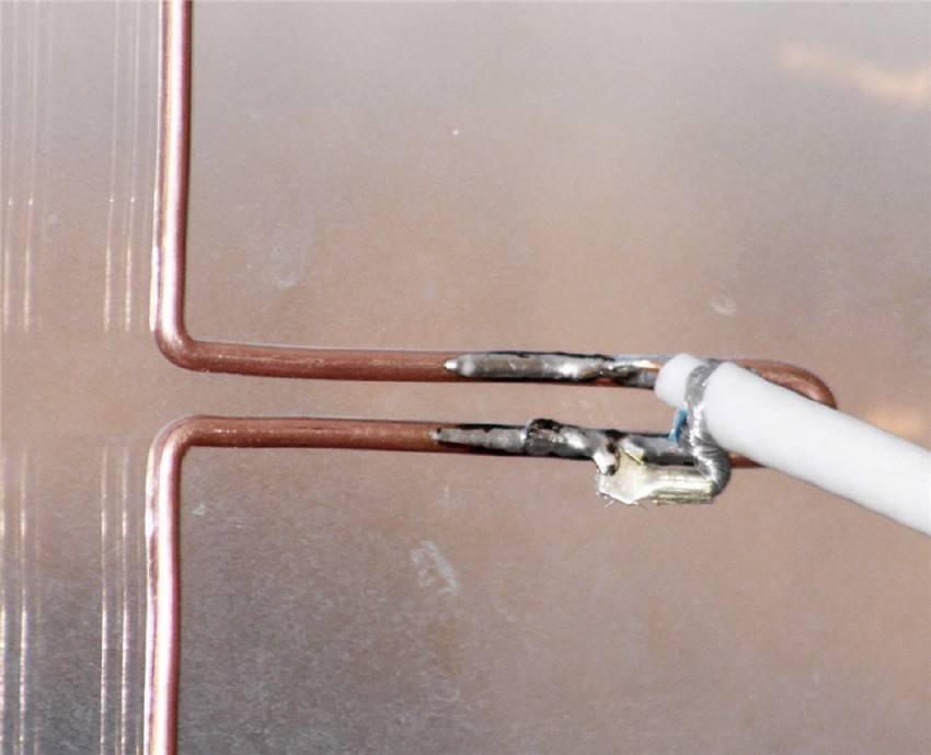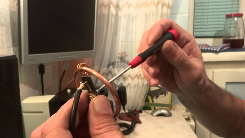 Средние жилы кабеля прикручивают (припаивают) к расплюснутым концам трубок, их оплетку соединяют куском такого же проводника. Добыть проволоку просто: отрезать от кабеля кусок чуть больше требуемого размера и освободить от всех оболочек. Концы зачистить и прикрутить к проводникам кабеля (лучше пропаять).