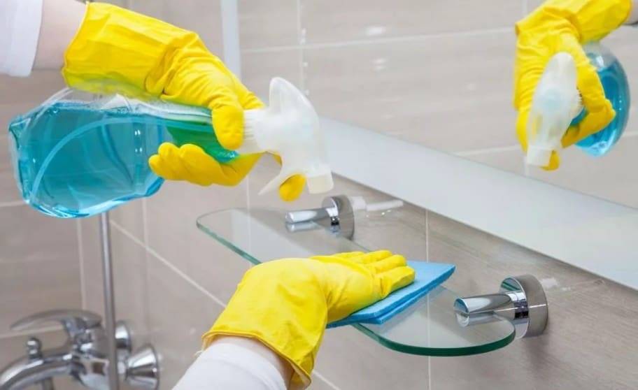 Обработка зеркал и смесителей специальными средствами. Ежедневное протирание позволяет убрать брызги, но не устраняет следы жесткой воды, пасты и мыла полностью. Отражающие поверхности протирают жидким спреем для стекол, а металлические — кремообразными средствами.