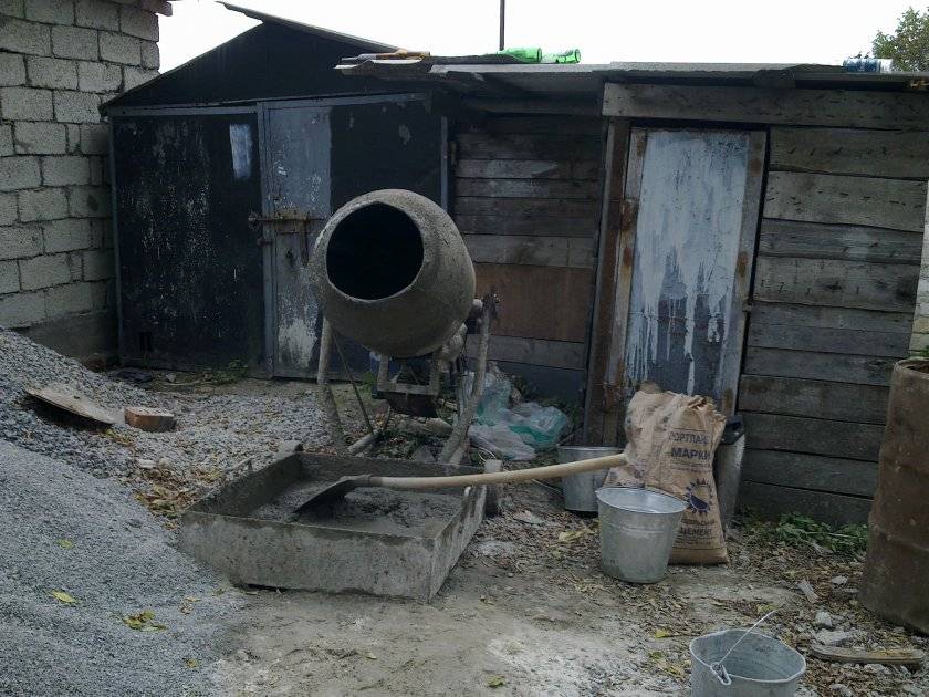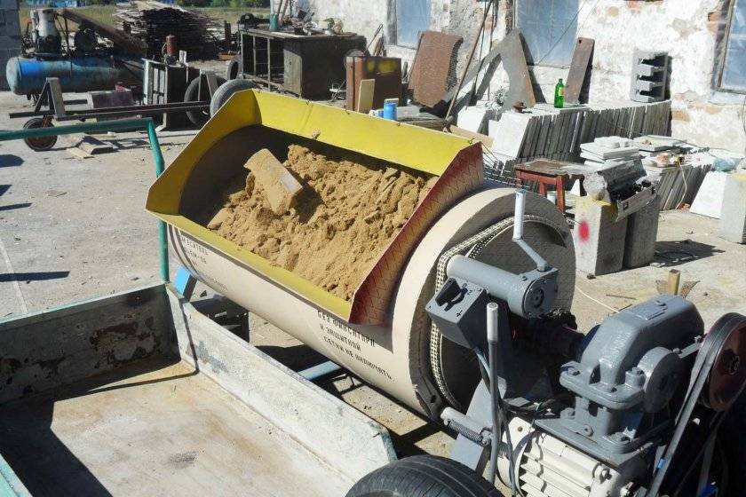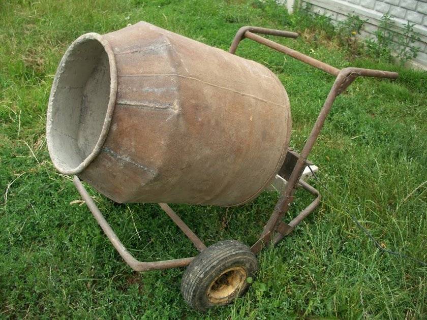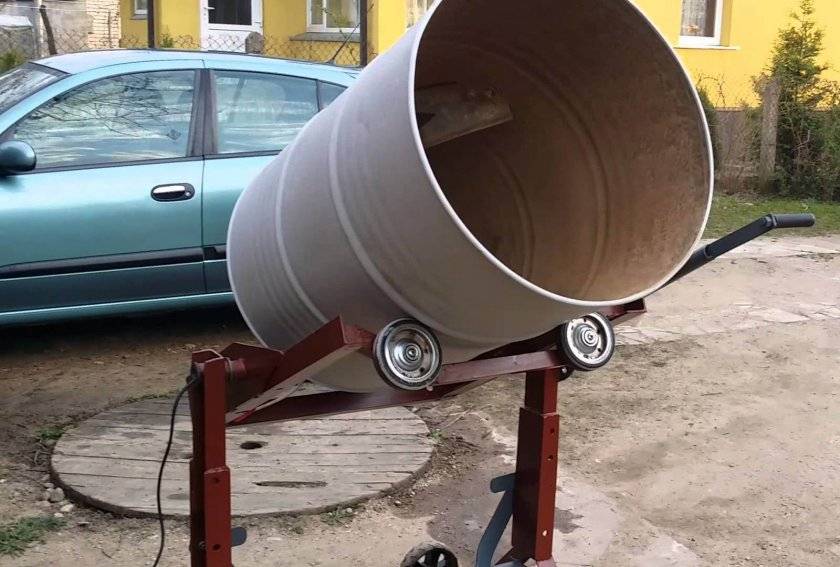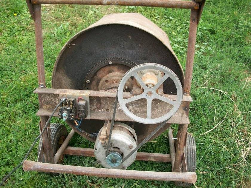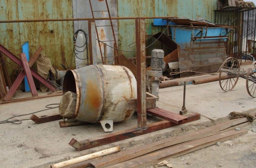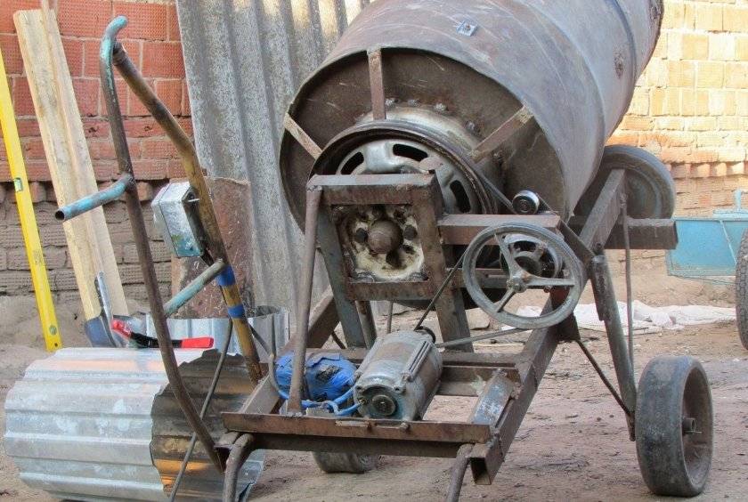 Самый простой вариант – это бетономешалка, которая работает с помощью человеческих усилий. В более сложном варианте используется электродвигатель. Но и он создается из подручных приспособлений.
