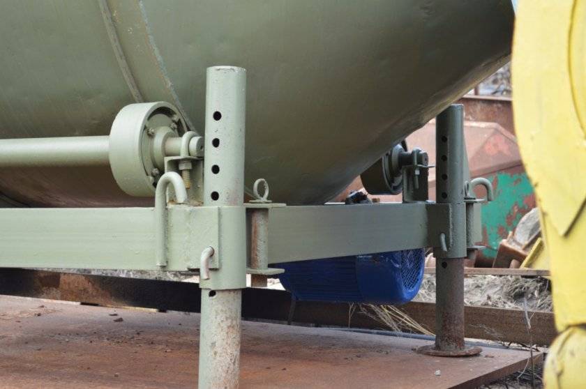 Но для удобства работы с аппаратом сам бак располагают на опоре шарнирно, тогда готовый раствор просто можно вылить в подставленную тару. Но это не является обязательным, емкость можно установить стационарно и предусмотреть возможность ее опрокидывания каким-либо иным способом или вручную доставать готовый бетон.
