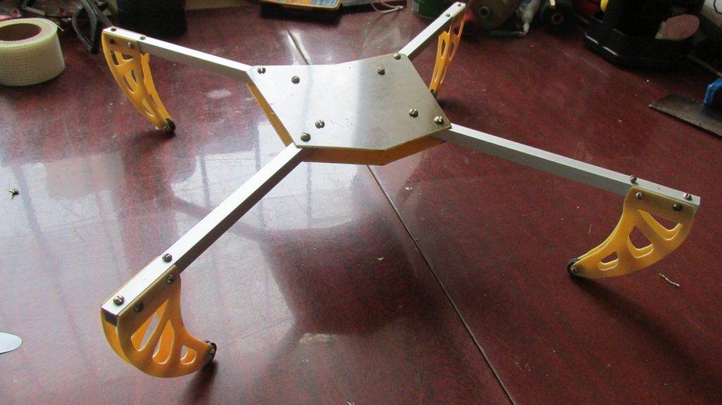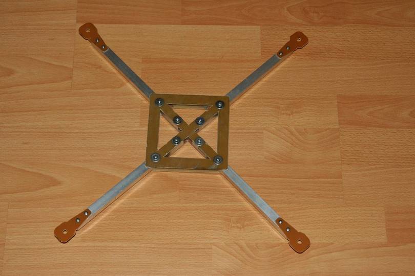 В любом случае на выходе должно получиться заданное количество лучей одинаковой длины, которые несут на себе моторы и крепятся к центральной несущей пластине. На ней же установлены посадочные опоры или «ноги». В некоторых вариантах компоновки ноги «растут» из-под двигателей. Все зависит от особенностей, продиктованных чертежом квадрокоптера и его рамы.