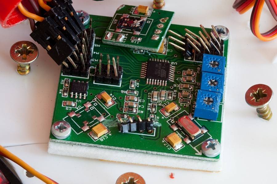 На финальном этапе сборки остается подключить к плате управления провода, отходящие от камеры и моторов. Сам микрочип при этом соединяют с аккумулятором.