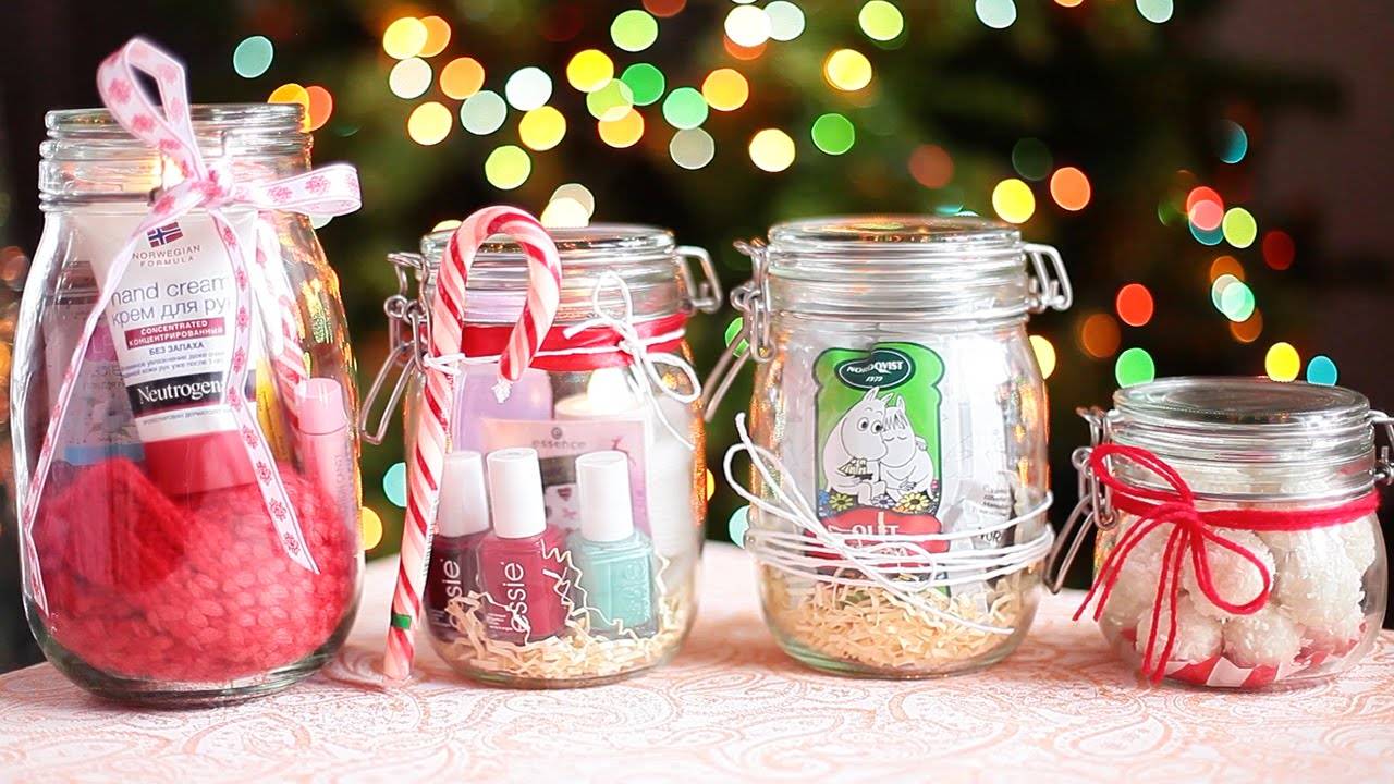 Презенты в банках из стекла. На дно банок укладывается небольшое количество ваты, сена или пенопласта. Горлышки банок украшаются лентами, бантами, бирками или сладкими леденцами.