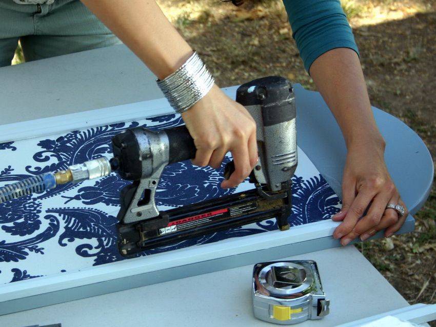 - Крепление ткани. Используйте строительный степлер для соединения ткани с ширмой. Обе детали перегородки должны хорошо высохнуть. Расстояние между скобками должно быть 4-5 см.