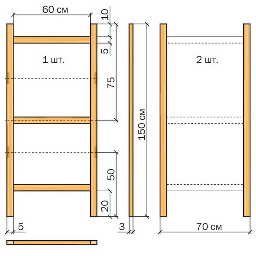 Бруски рекомендуется взять толщиной 2 см и шириной 6 см. При этом одна половина должна иметь длину 170 см, а другая – 60 см. Этапы: