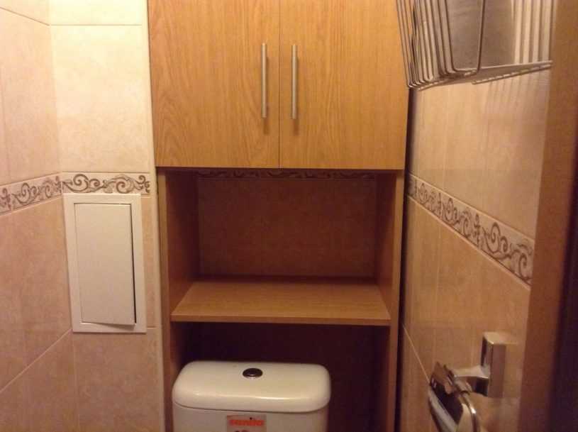 Над унитазом можно повесить обычный навесной шкаф подходящей ширины и высоты. Это может быть часть кухонного гарнитура или часть прихожей. В любой модульной коллекции можно найти подходящий образец. Придется только выпилить в задней стенке отверстия под канализационные и водопроводные стояки, но эта переделка несложная.