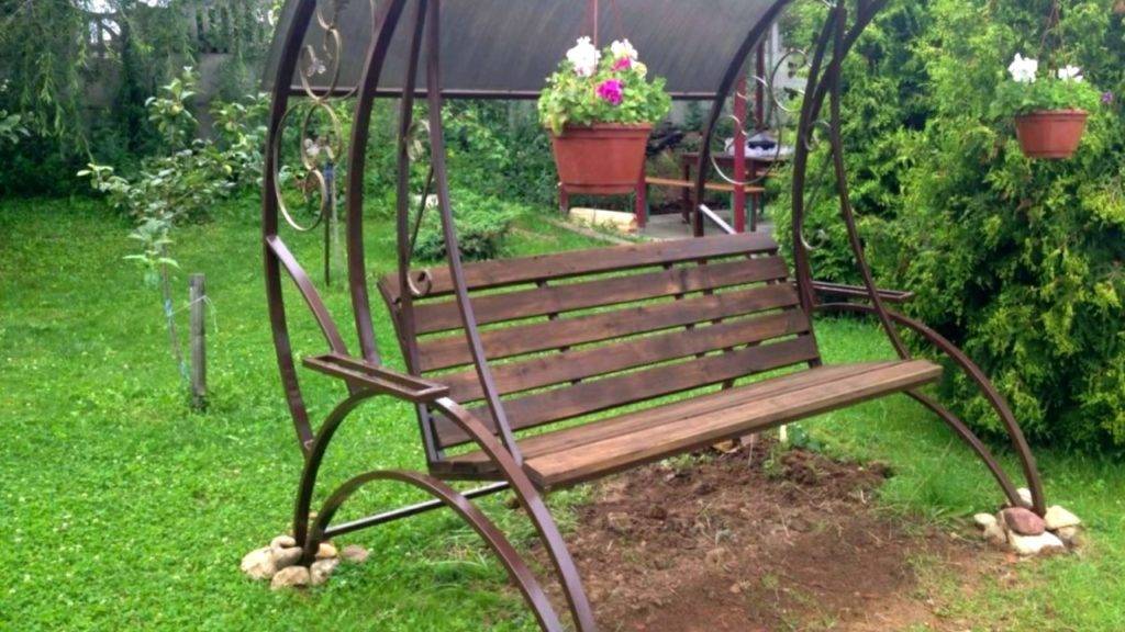 Неплохой вариант для дачи – подвесные лавки-качели со спинкой. Продаются из различных материалов, имеют самую разную форму и конструкцию. Лучше покупать модели с тентом, а если делаете такие качели своими руками – соорудить навес из плотной ткани, например, брезента, который защитит от солнца и дождя. Также можно сделать «крышу» из сотового поликарбоната – практично и надежно.