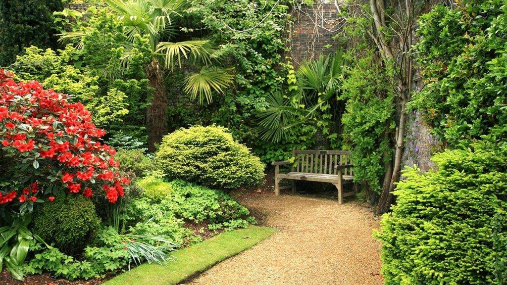 Наличие живой зеленой изгороди, рядом цветущие клумбы и пруд.